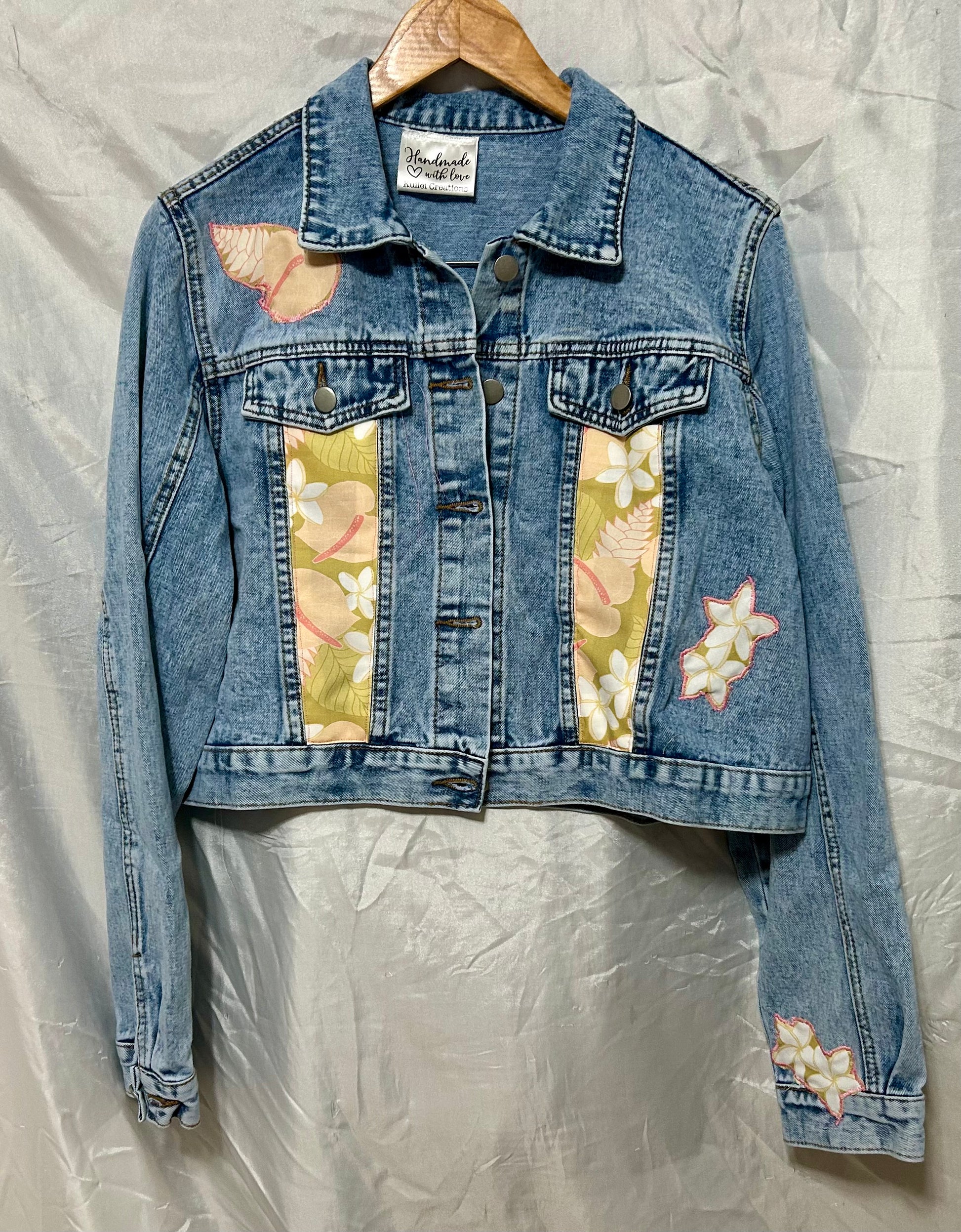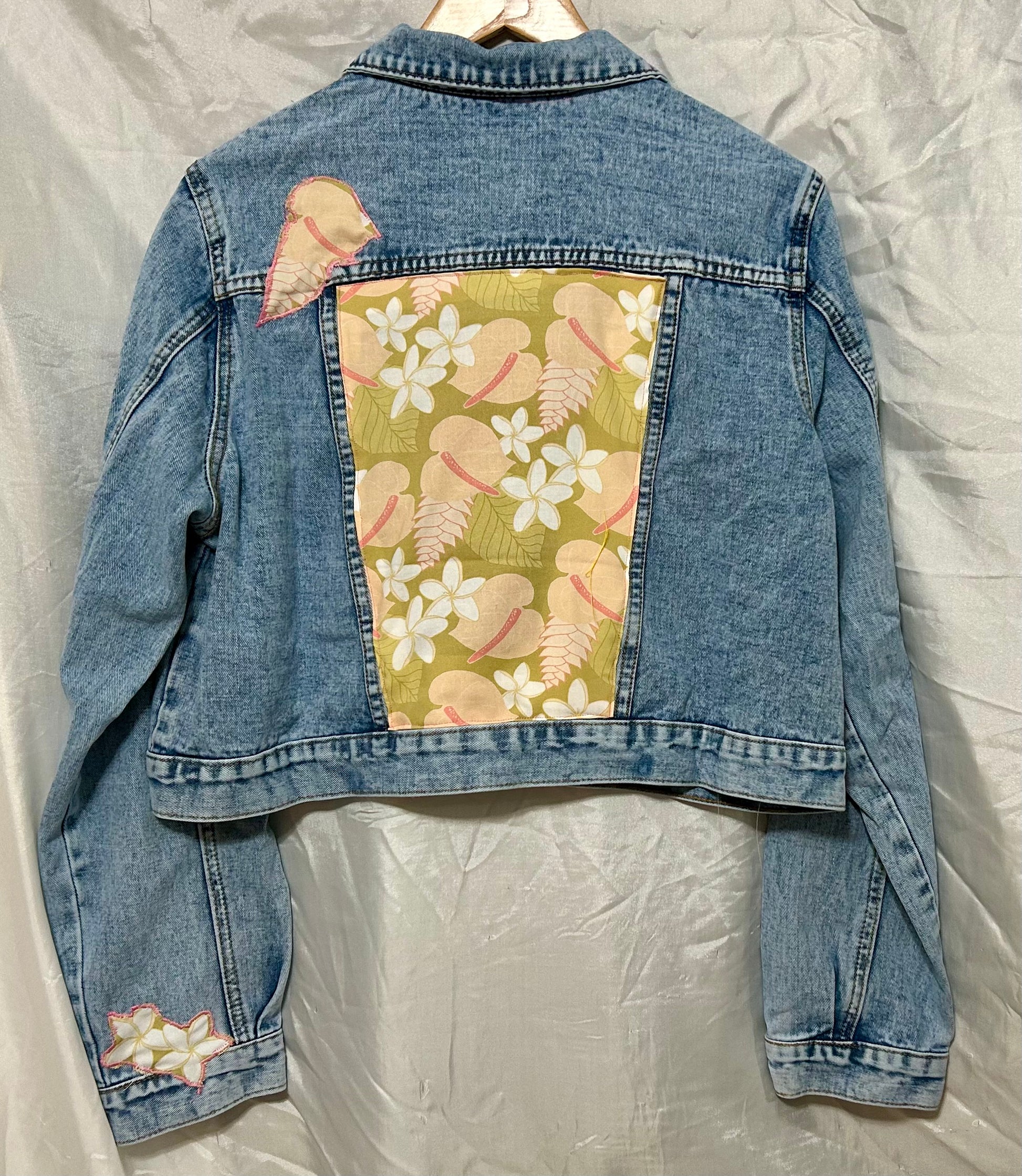 Discover your new favorite piece with this one-of-a-kind handmade wash denim jacket. Crafted with care and attention to detail, this jacket features a unique Kalo Leaf Leis fabric sewn into the design, bringing the spirit of the islands right to your wardrobe. The jacket also showcases applique Anthurium Flowers, adding texture and a touch of island charm.