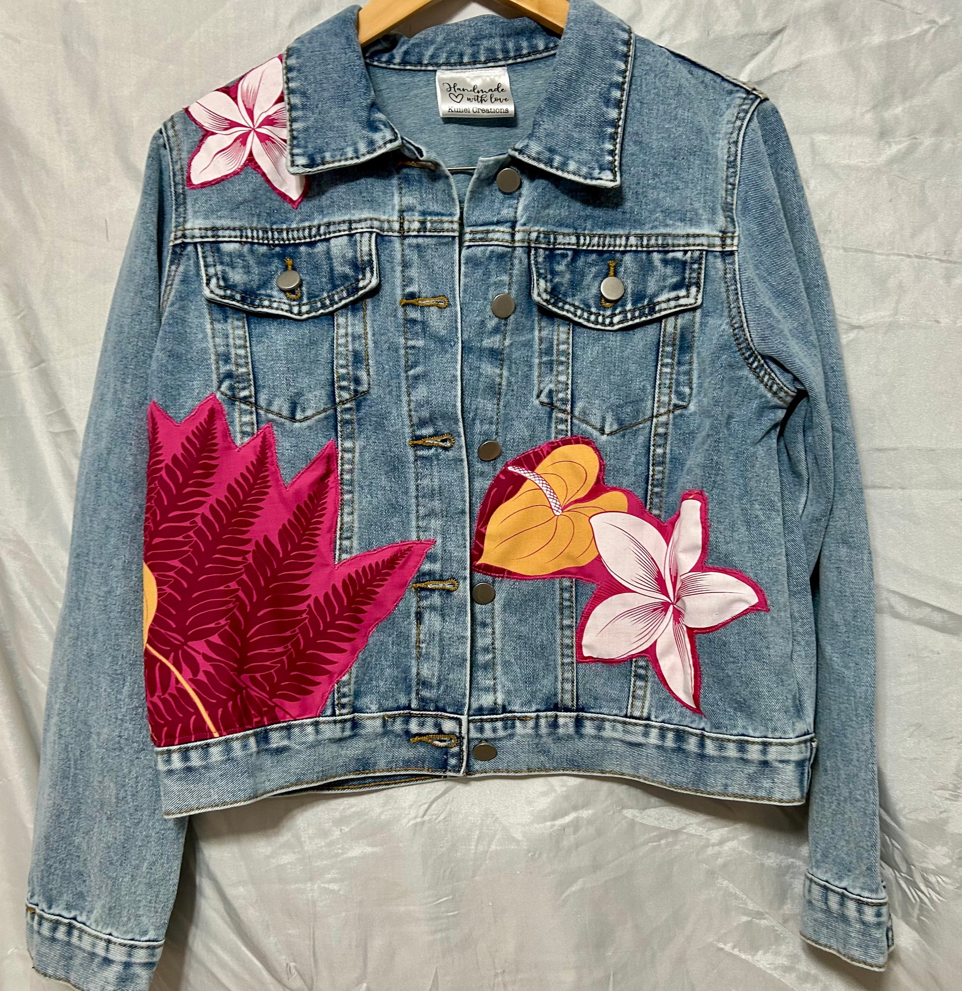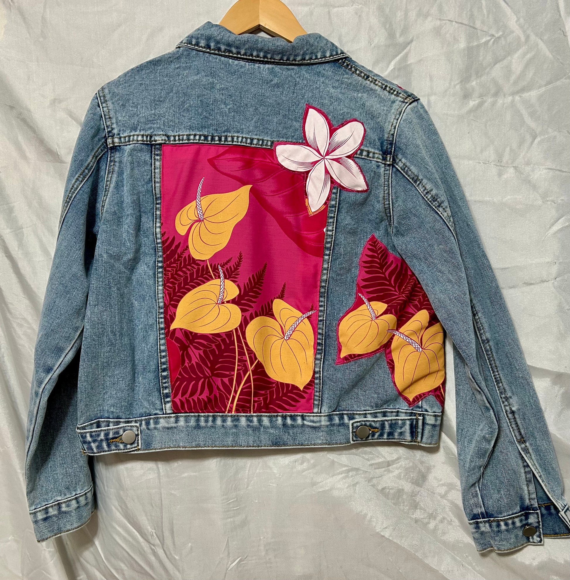 Handmade Hawaiian Denim Jacket – Large – Fuchsia & Gold with Anthurium Appliqué