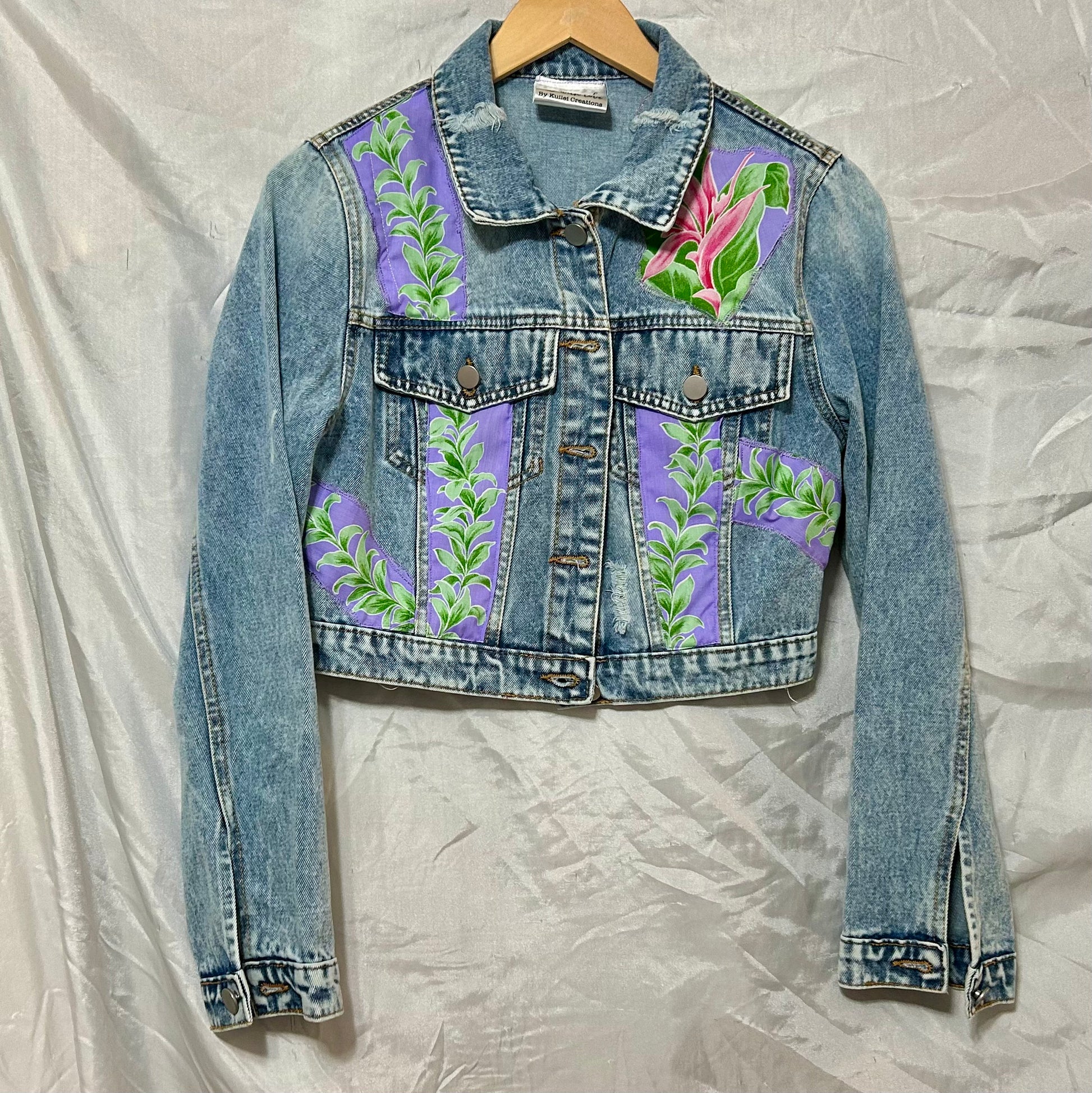 Discover your new favorite piece with this one-of-a-kind handmade wash denim jacket. Crafted with care and attention to detail, this jacket features a unique Hawaiian fabric sewn into the design, bringing the spirit of the islands right to your wardrobe. The jacket also showcases appliqué birds of paradise flowers, adding texture and a touch of coastal charm.