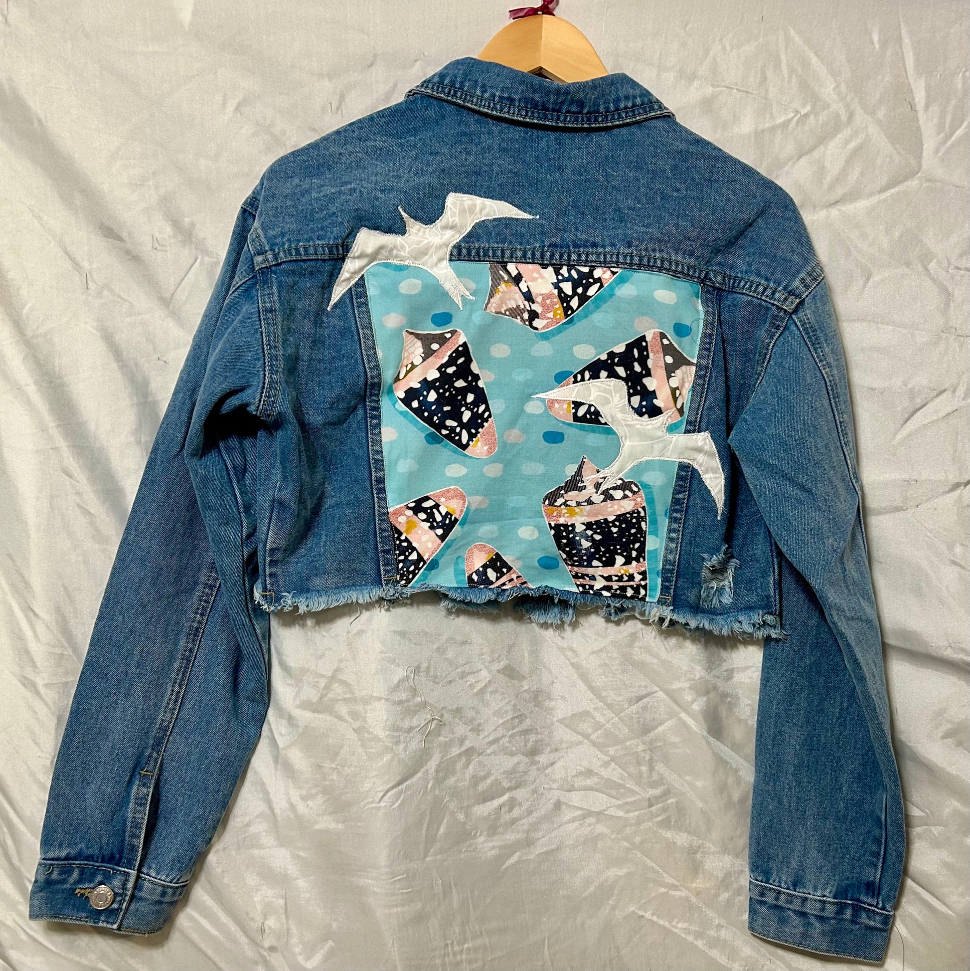 Handmade Cropped Denim Jacket – Medium – Cone Shell Fabric Inlay with ʻIwa Bird Appliqué