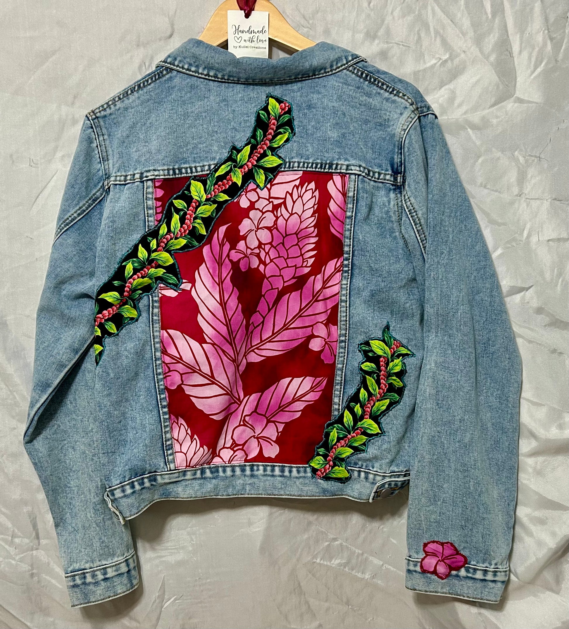 Discover your new favorite piece with this one-of-a-kind handmade wash denim jacket. Crafted with care and attention to detail, this jacket features a unique Ginger Maile Leis fabric sewn into the design, bringing the spirit of the islands right to your wardrobe. The jacket also showcases appliqué Ginger Maile Leis, adding texture and a touch of island charm.
