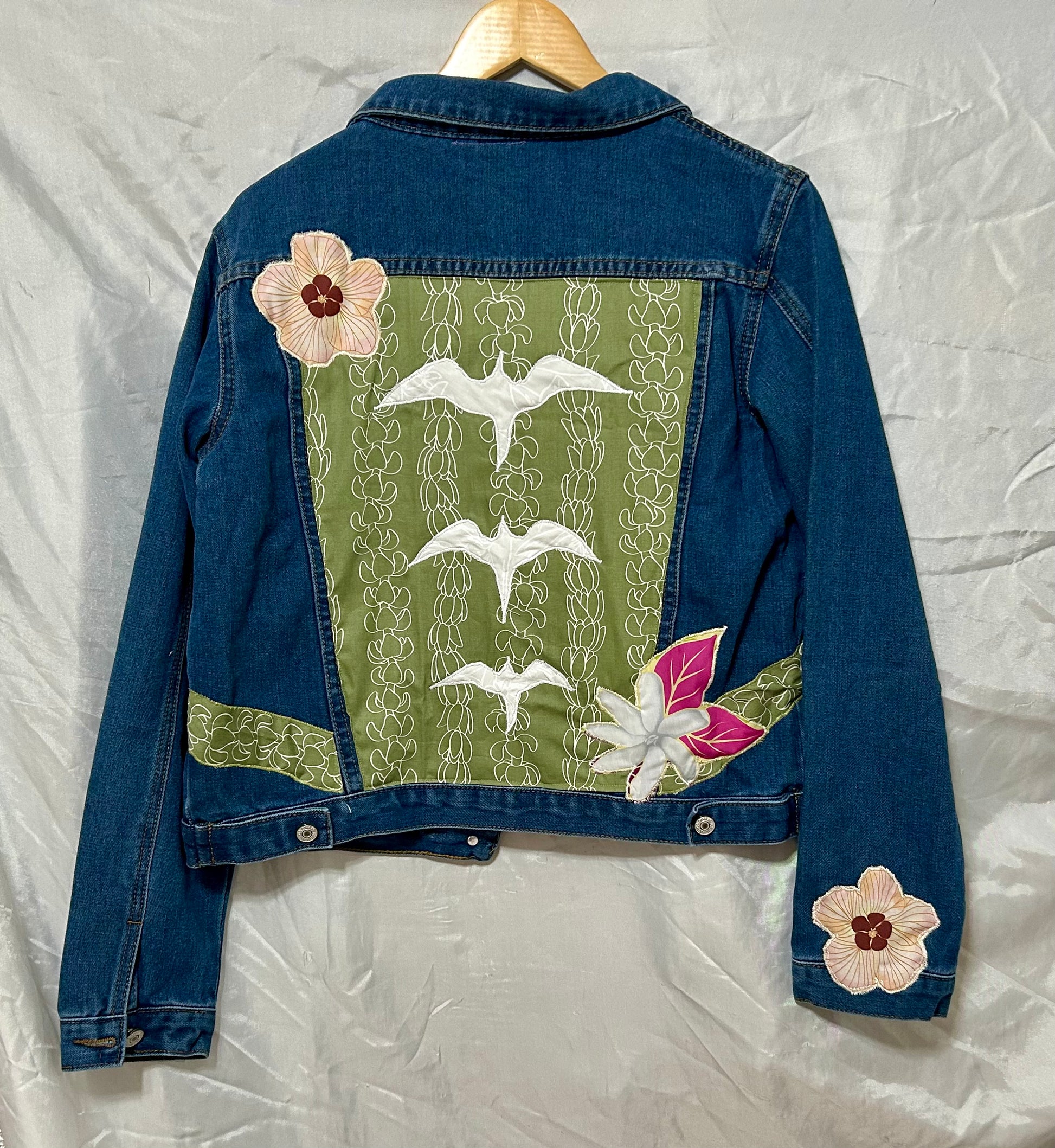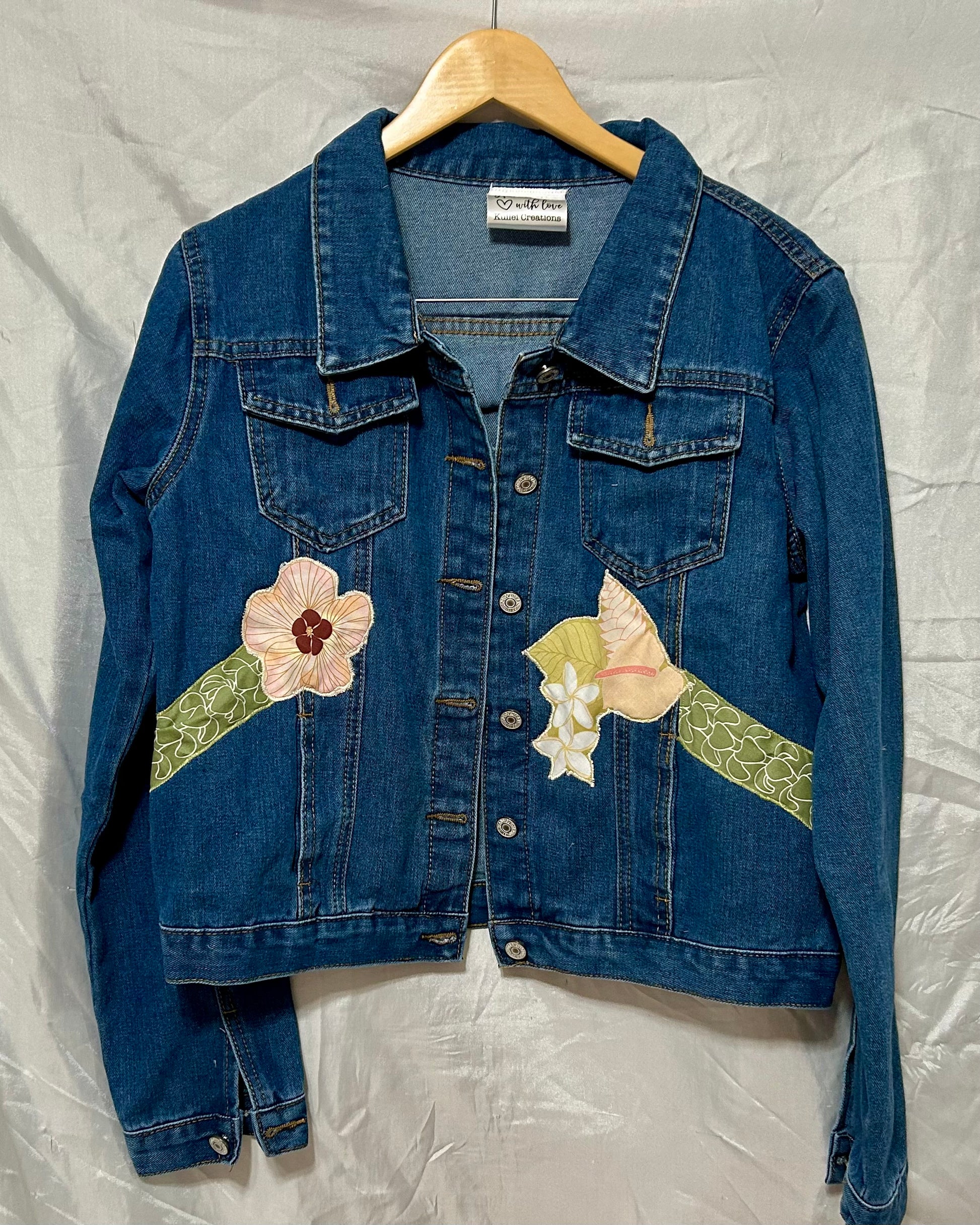 Handmade Denim Jacket – Puakenikeni, Pikake, Hau & Hawaiian Flower Lei Appliqué | Unique Original | Made in Hawai‘i