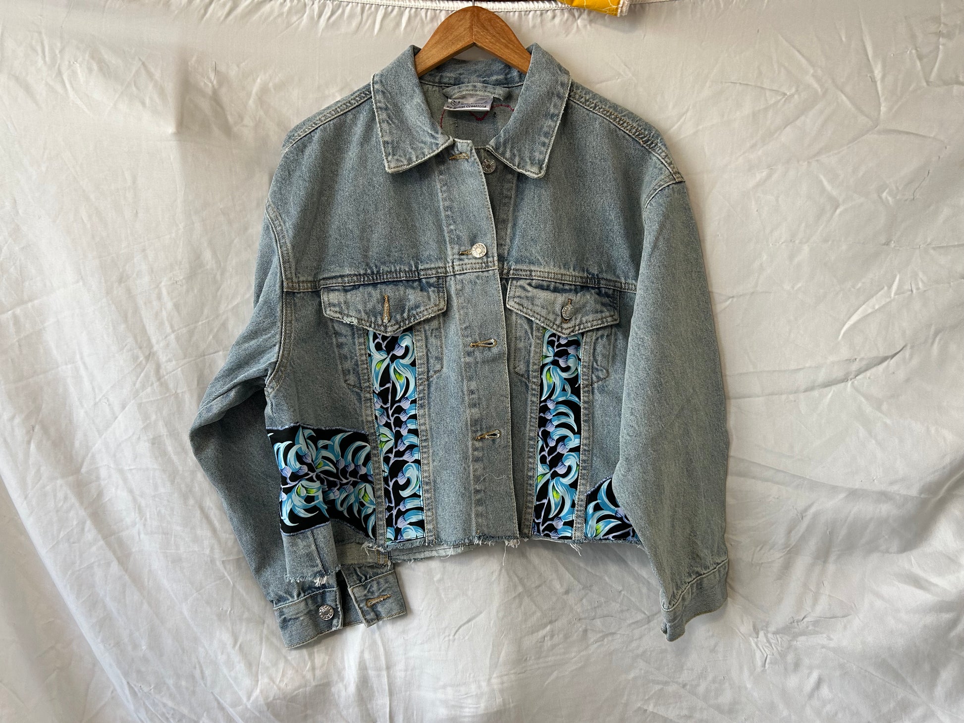Discover your new favorite piece with this one-of-a-kind handmade wash denim jacket. Crafted with care and attention to detail, this jacket features a unique Hawaiian Green Jade Leis fabric sewn into the design, bringing the spirit of the islands right to your wardrobe. The jacket also showcases appliqué birds and leis, adding texture and a touch of island charm.