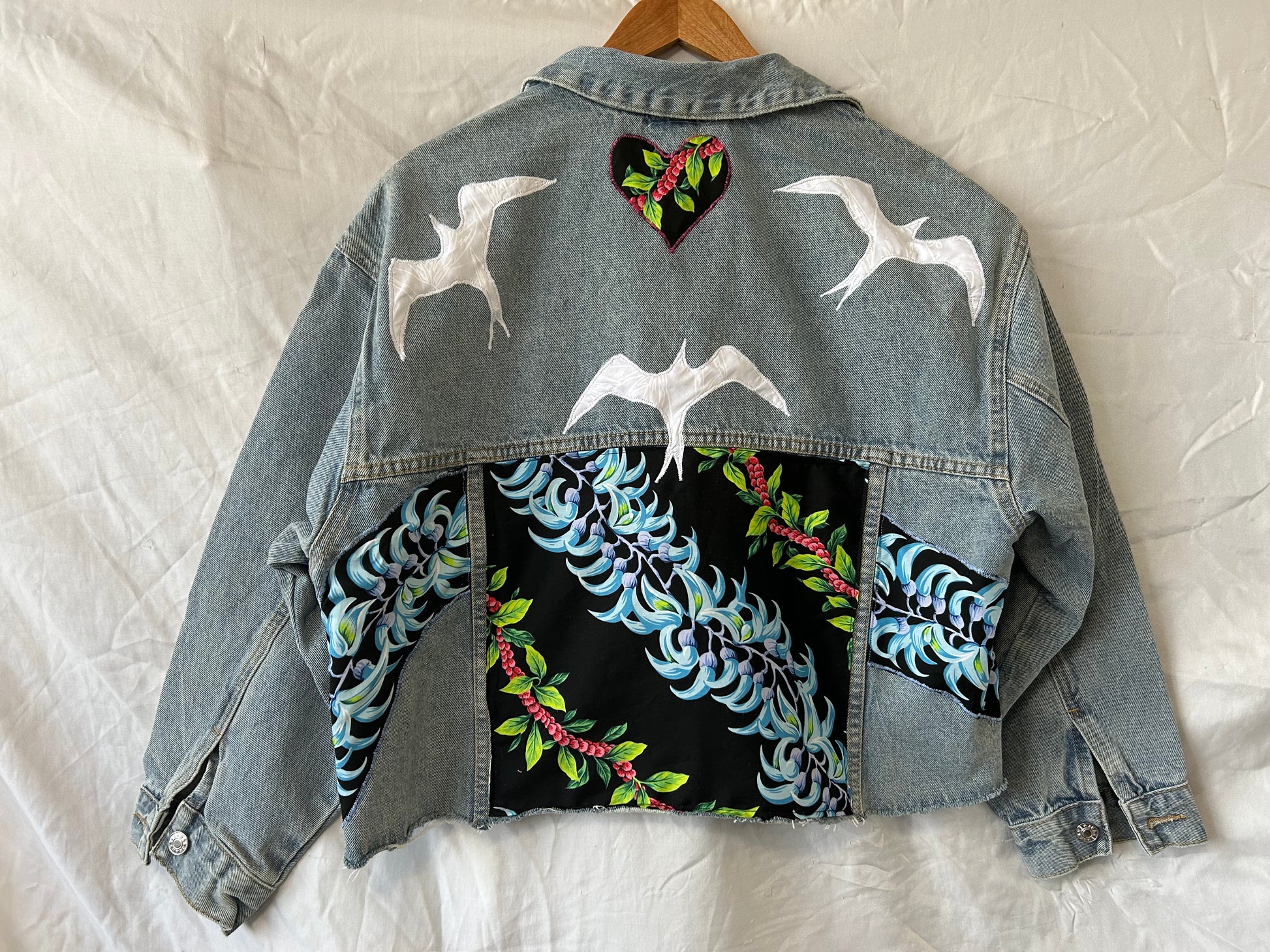 Handmade Wash Denim Jacket – One of a Kind Fabric & Appliqué 'Iwa Birds and Flower Leis Details (Size Medium)