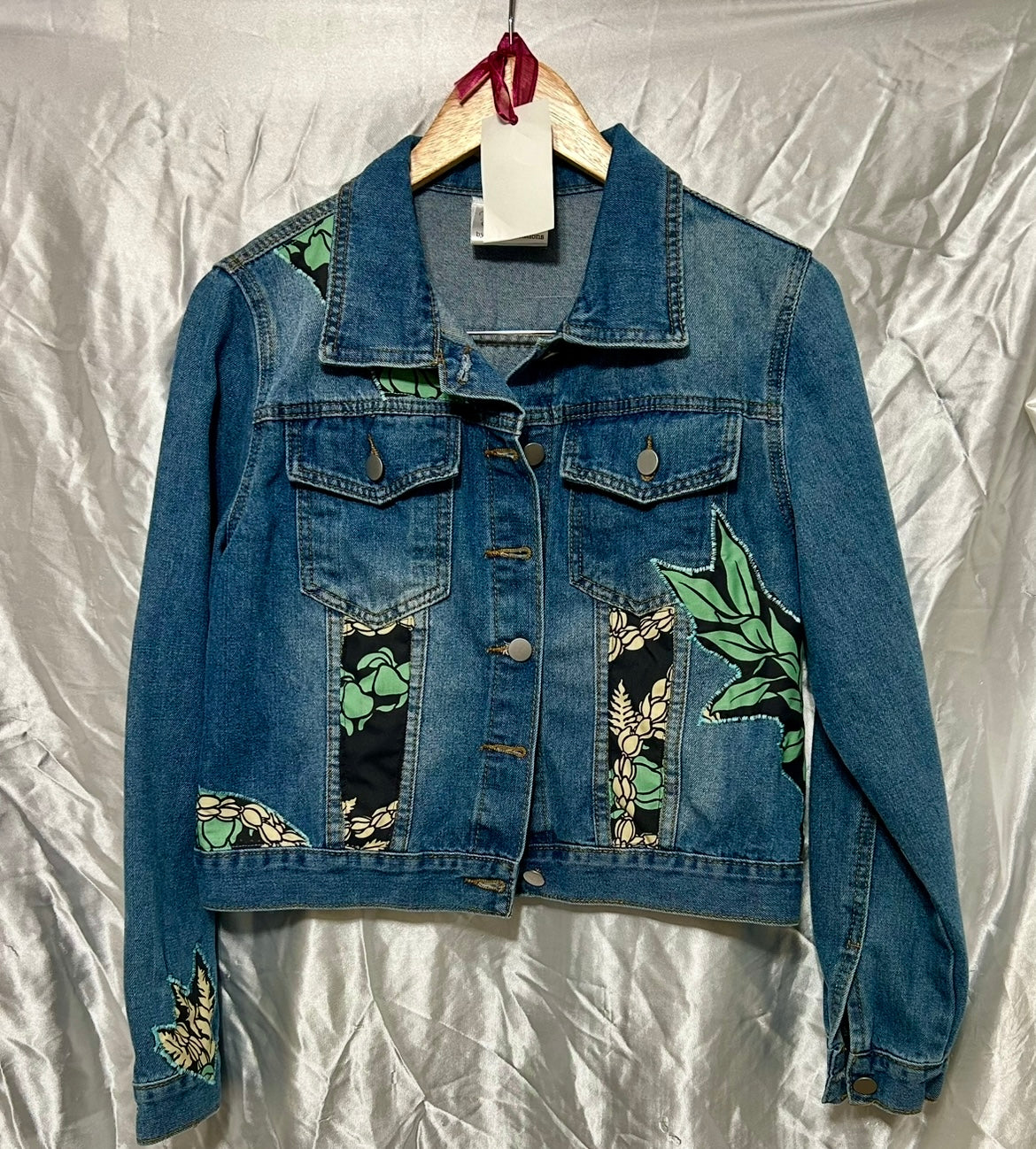 Discover your new favorite piece with this one-of-a-kind handmade wash denim jacket. Crafted with care and attention to detail, this jacket features a unique Green Flower Leis fabric sewn into the design, bringing the spirit of the islands right to your wardrobe. The jacket also showcases applique Green Flower Leis, adding texture and a touch of island charm.