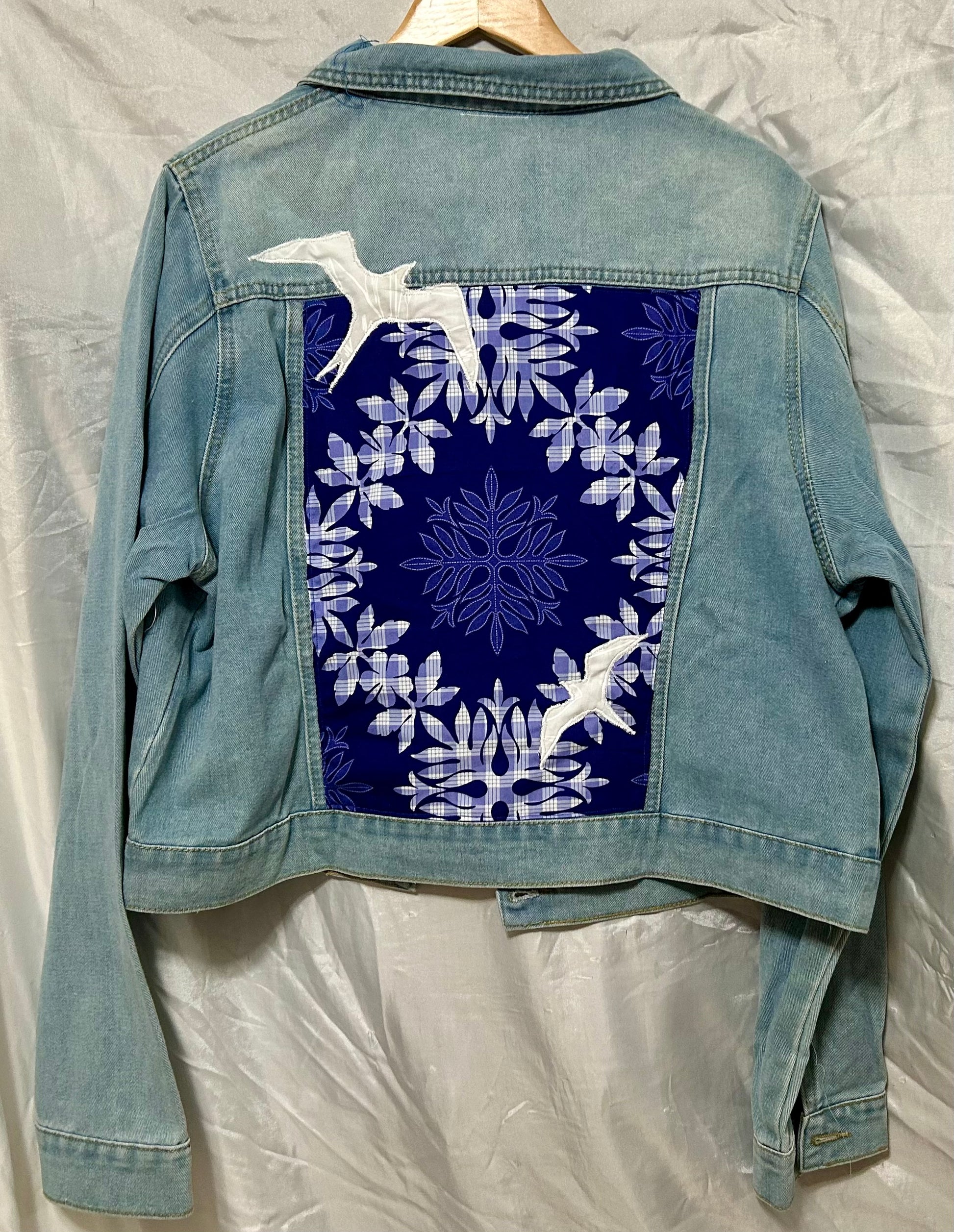 Handmade Wash Denim Jacket – One of a Kind with Hawaiian Quilt Fabric & Appliqué 'Iwa Birds Details (Size XL)