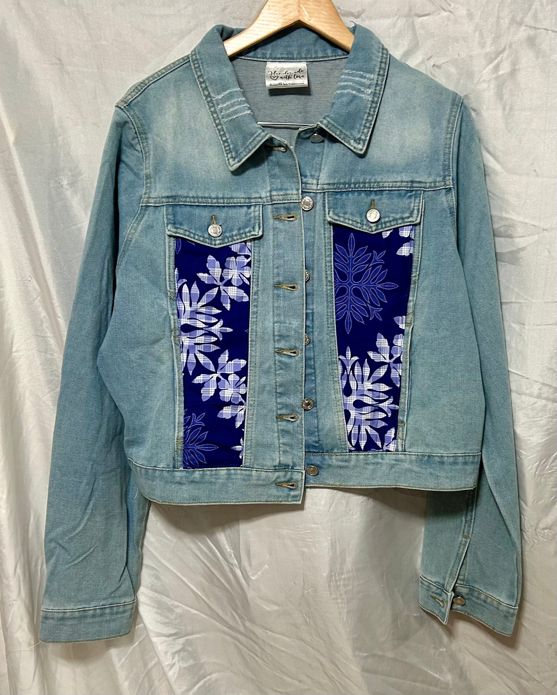 Discover your new favorite piece with this one-of-a-kind handmade wash denim jacket. Crafted with care and attention to detail, this jacket features a unique Hawaiian Quilt fabric sewn into the design, bringing the spirit of the islands right to your wardrobe. The jacket also showcases appliqué 'Iwa Birds, adding texture and a touch of island charm.