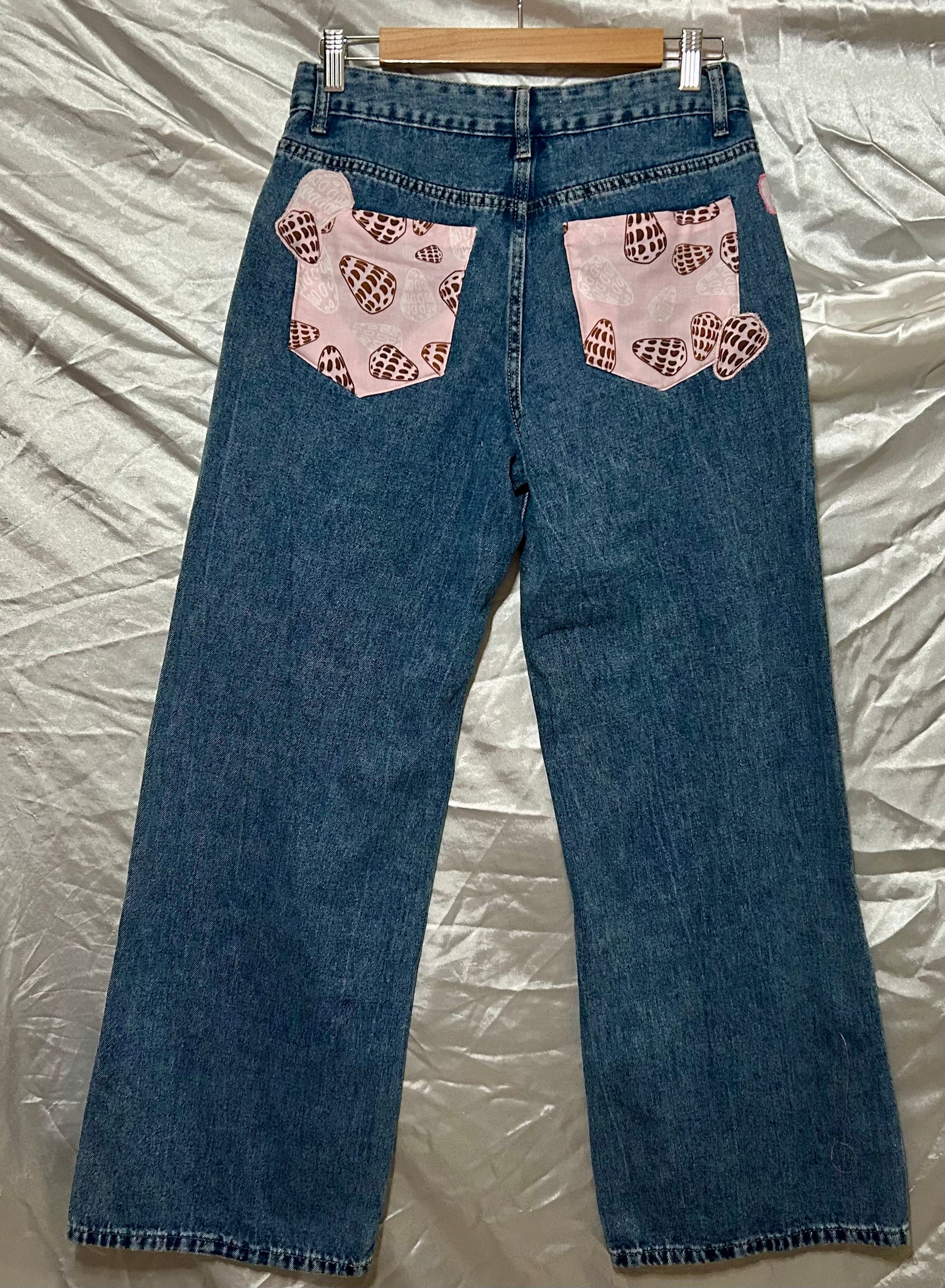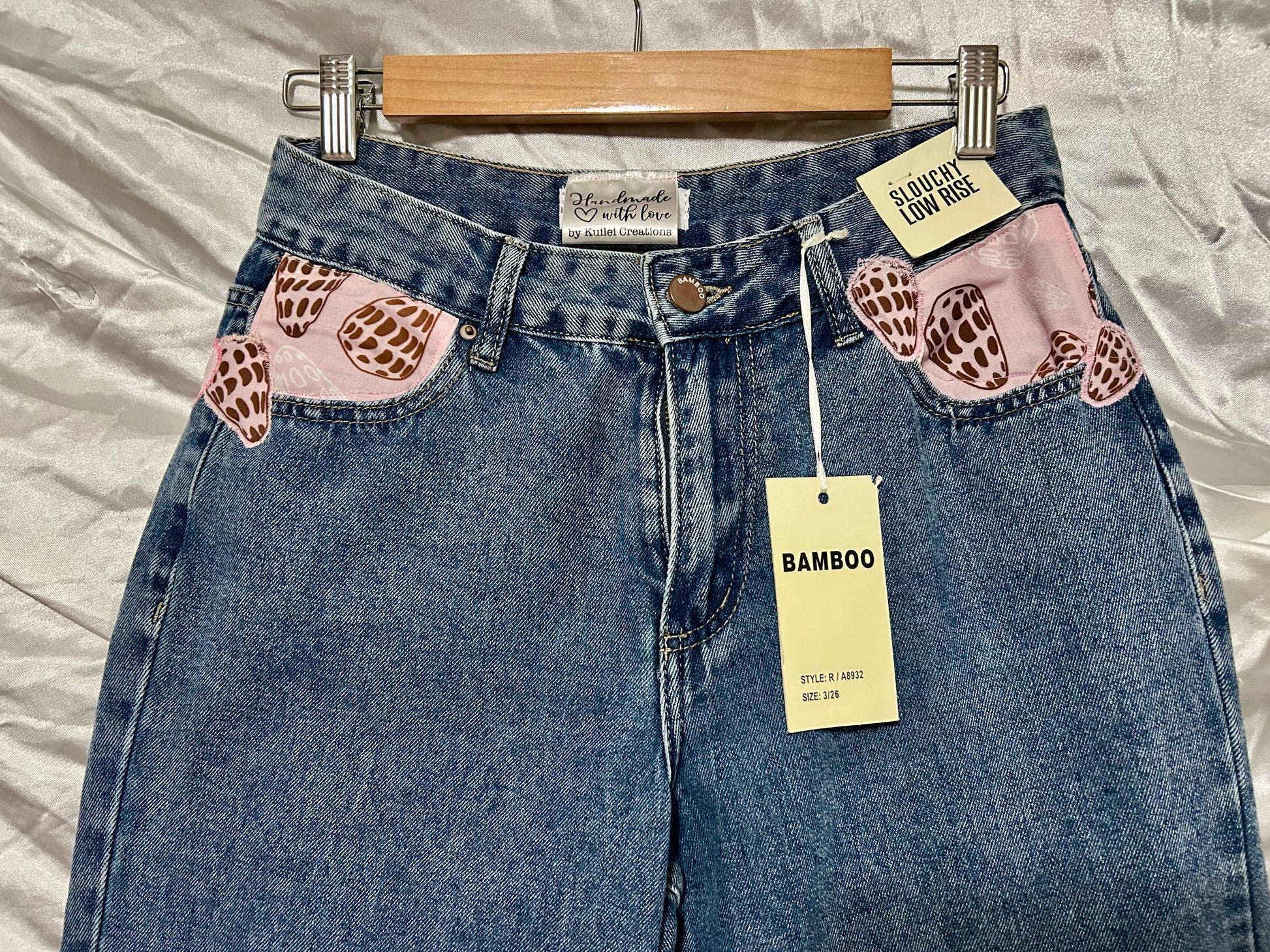 One of a kind original jeans with pink Hebrew Cone Shell fabric, size 3