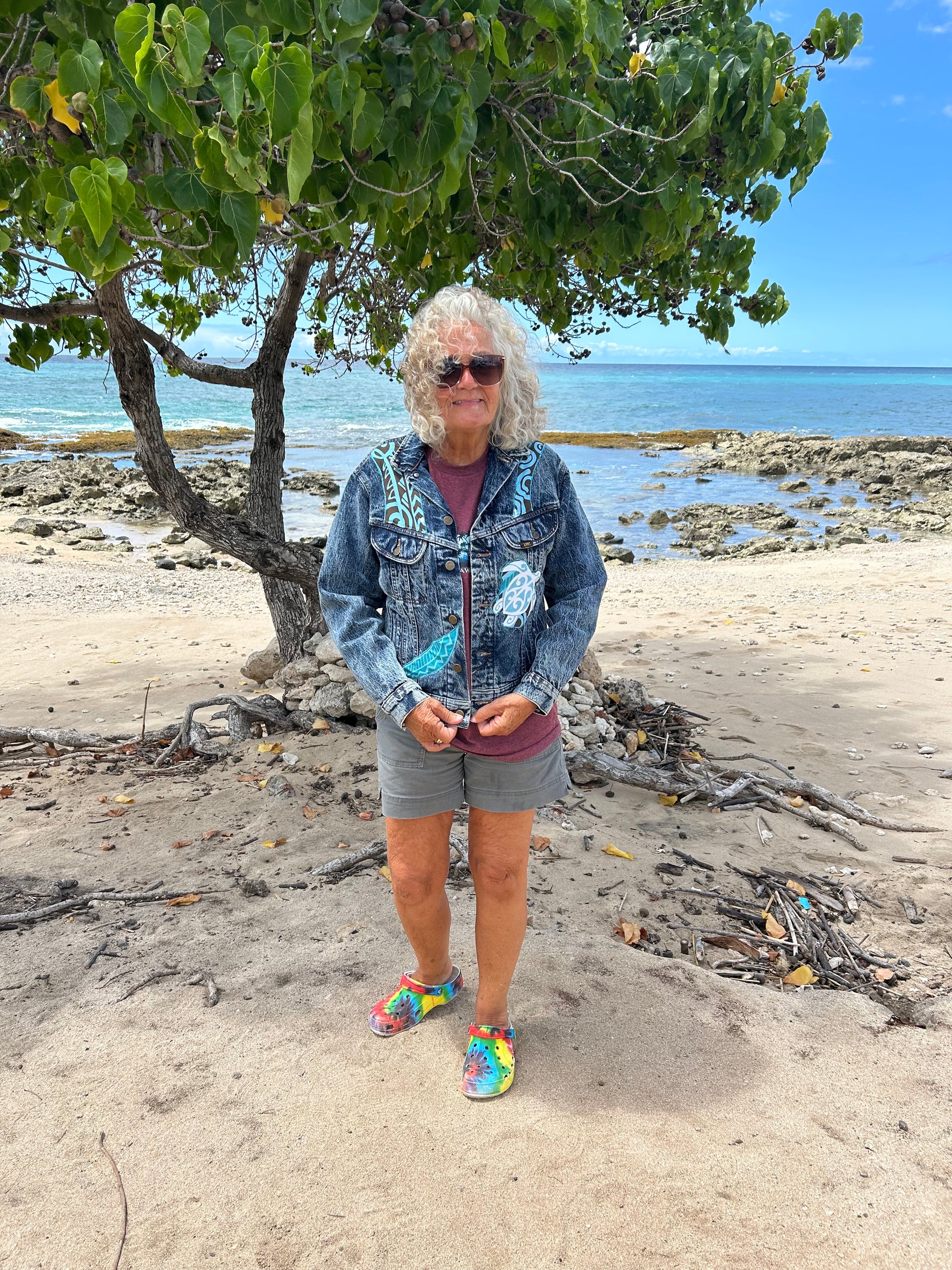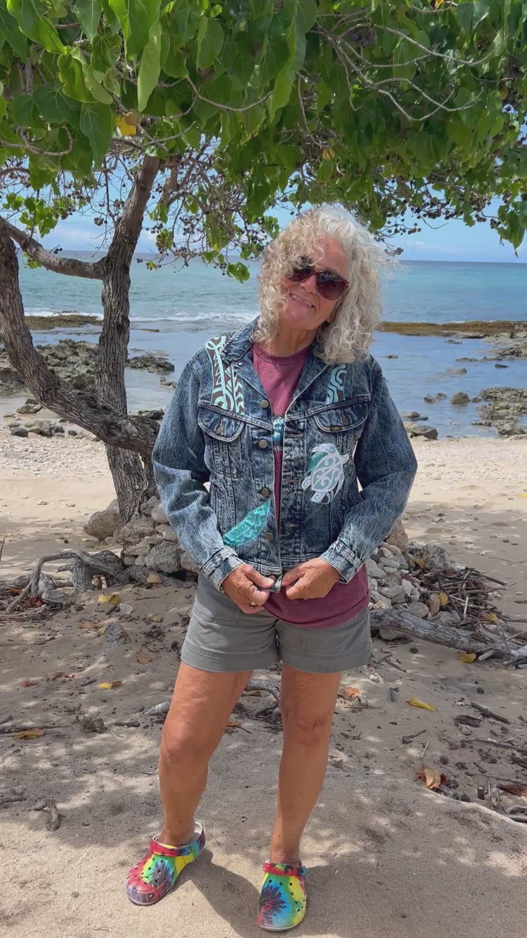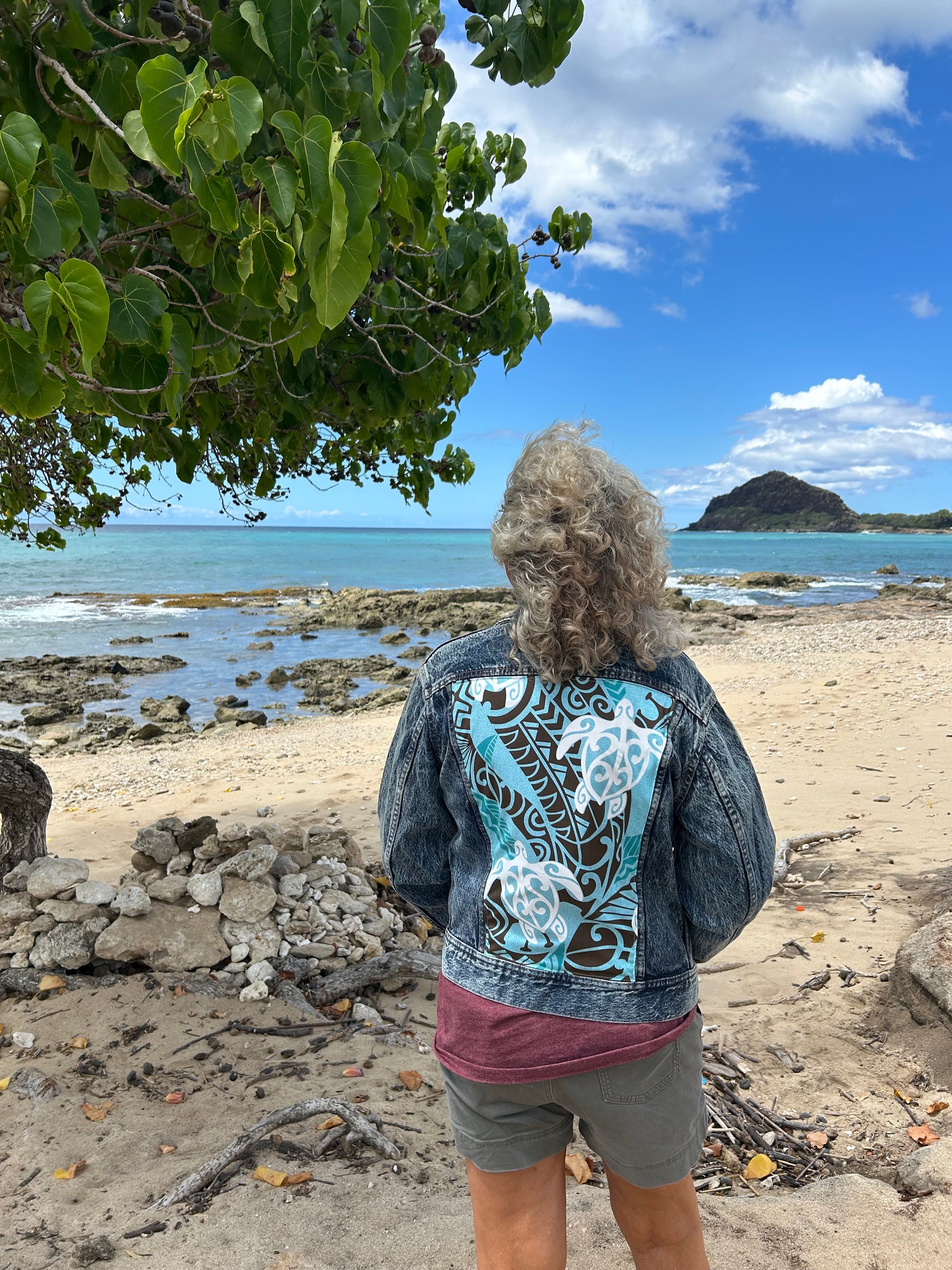 Discover your new favorite piece with this one-of-a-kind handmade wash denim jacket. Crafted with care and attention to detail, this jacket features a unique Hawaiian Honus fabric sewn into the design, bringing the spirit of the islands right to your wardrobe. The jacket also showcases appliqué Honus, adding texture and a touch of island charm.