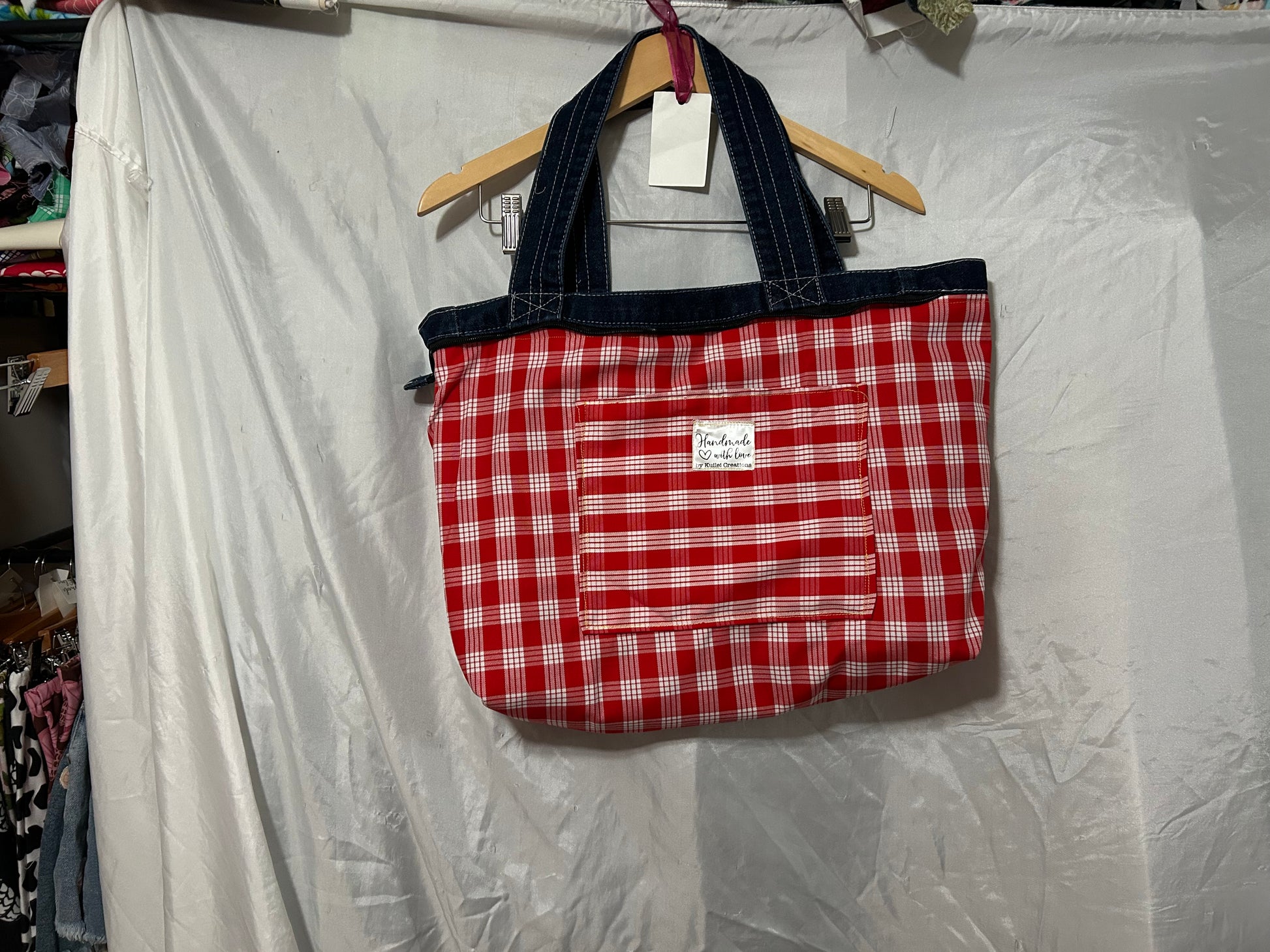 One of a kind unique handbag with 5 pockets zipper closure, and fully reversible.