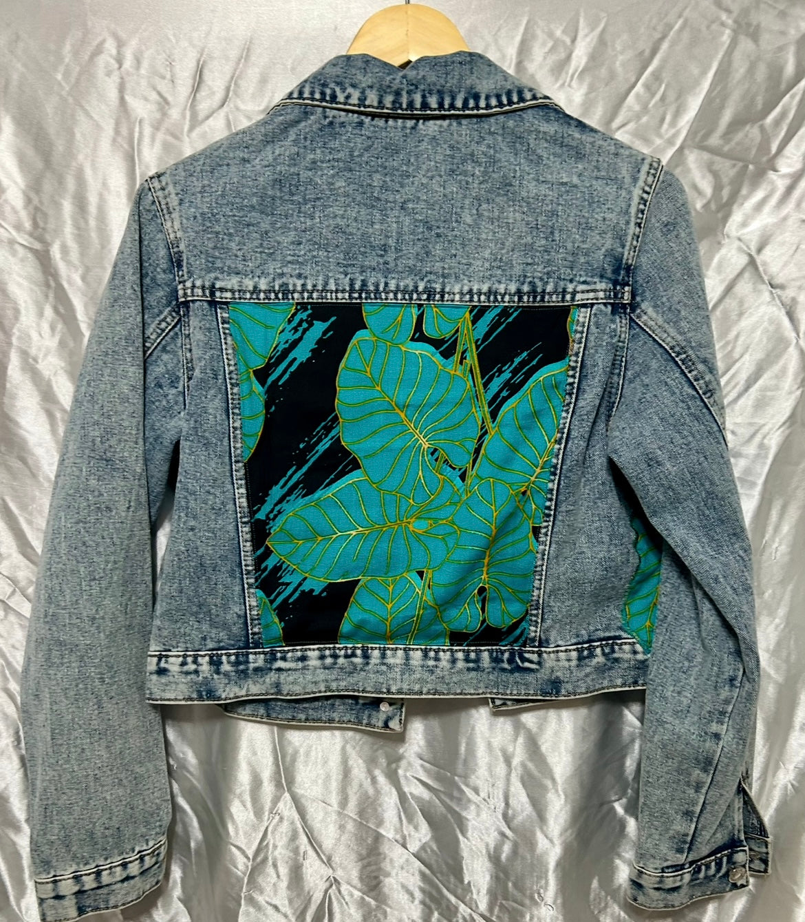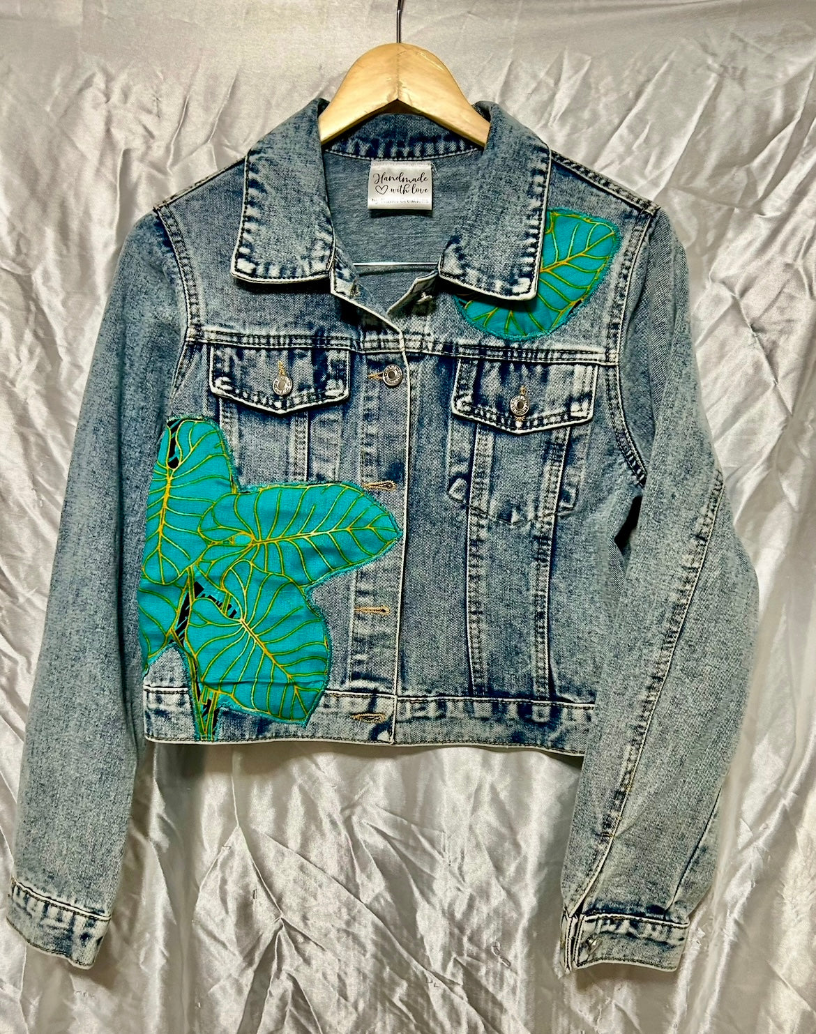 Discover your new favorite piece with this one-of-a-kind handmade wash denim jacket. Crafted with care and attention to detail, this jacket features a unique Kalo Leaf Leis fabric sewn into the design, bringing the spirit of the islands right to your wardrobe. The jacket also showcases applique Kalo Leaves, adding texture and a touch of island charm.