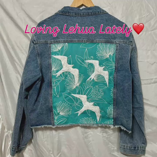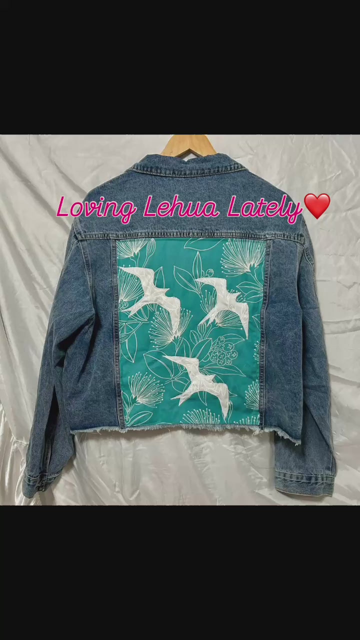 Discover your new favorite piece with this one-of-a-kind handmade denim jacket. Crafted with care and attention to detail, this jacket features a unique Hawaiian Lehua Flower fabric sewn into the design, bringing the spirit of the islands right to your wardrobe. The jacket also showcases appliqué birds, adding texture and a touch of coastal charm.