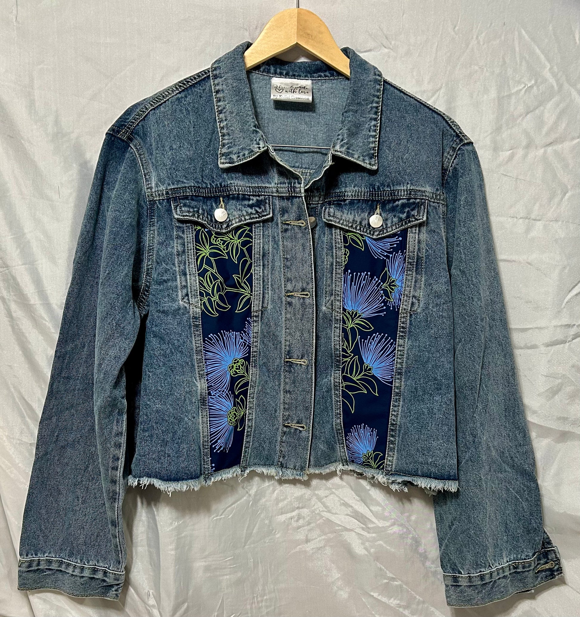 Discover your new favorite piece with this one-of-a-kind handmade wash denim jacket. Crafted with care and attention to detail, this jacket features a unique Hawaiian Lehua fabric sewn into the design, bringing the spirit of the islands right to your wardrobe. The jacket also showcases bright color and style, adding texture and a touch of aloha charm.