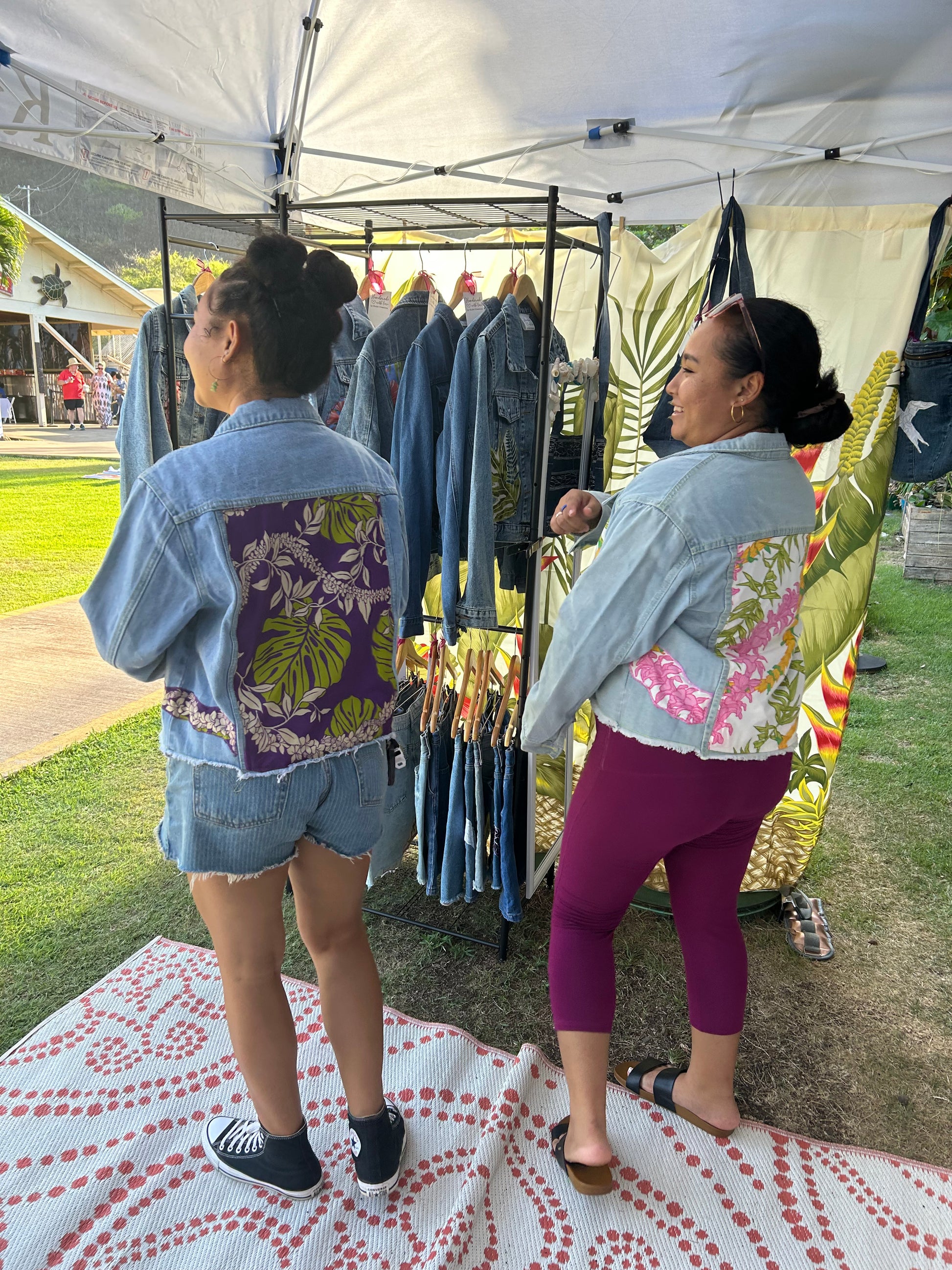 Discover your new favorite piece with this one-of-a-kind handmade wash denim jacket. Crafted with care and attention to detail, this jacket features a unique Flower Leis fabric sewn into the design, bringing the spirit of the islands right to your wardrobe. The jacket also showcases appliqué Flower Leis, adding texture and a touch of island charm.