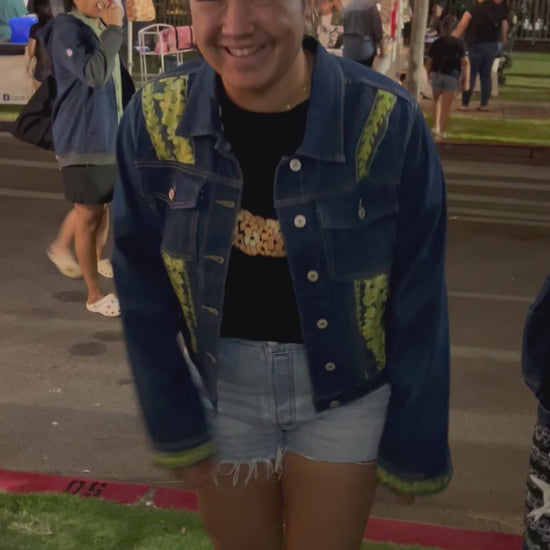 Discover your new favorite piece with this one-of-a-kind handmade wash denim jacket. Crafted with care and attention to detail, this jacket features a unique Hebrew Cone shells fabric sewn into the design, bringing the spirit of the islands right to your wardrobe. The jacket also showcases appliqué Iwa Birds, adding texture and a touch of island charm.