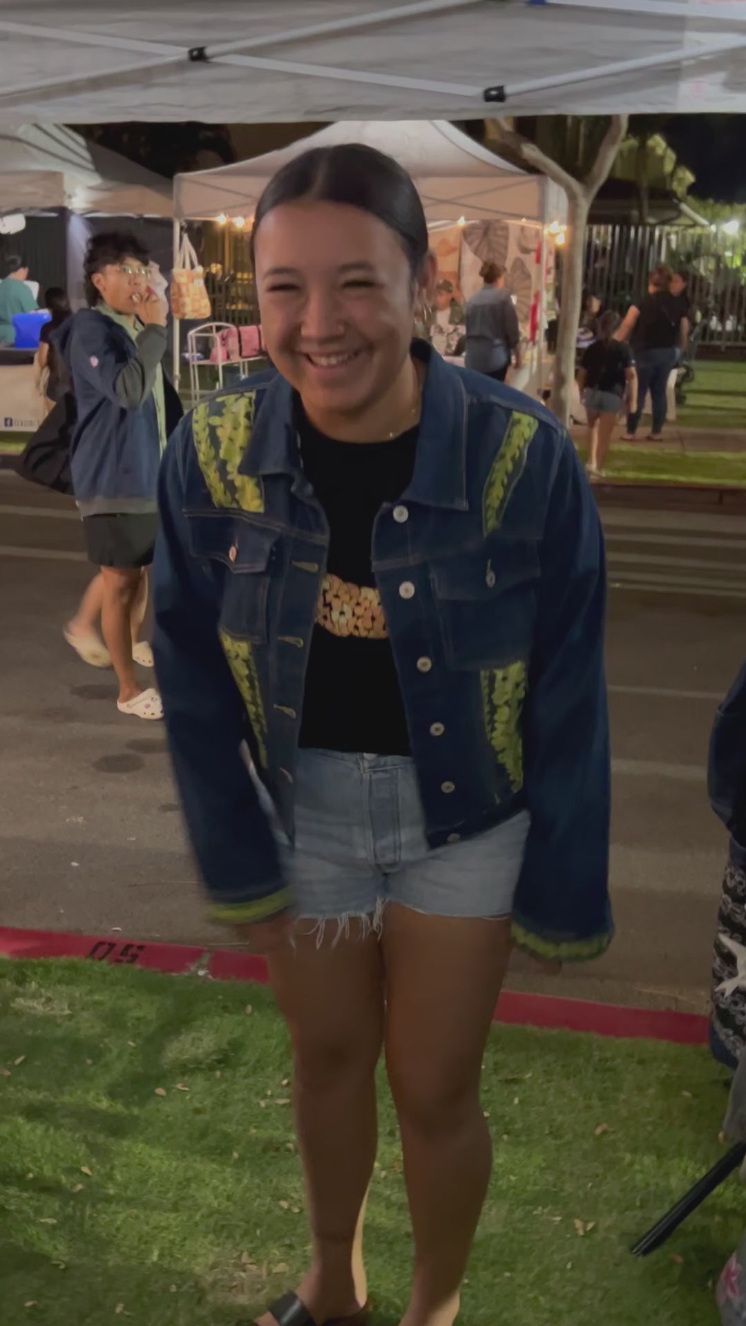 Material: Acid wash denim with Hawaiian shells fabric and appliqué details