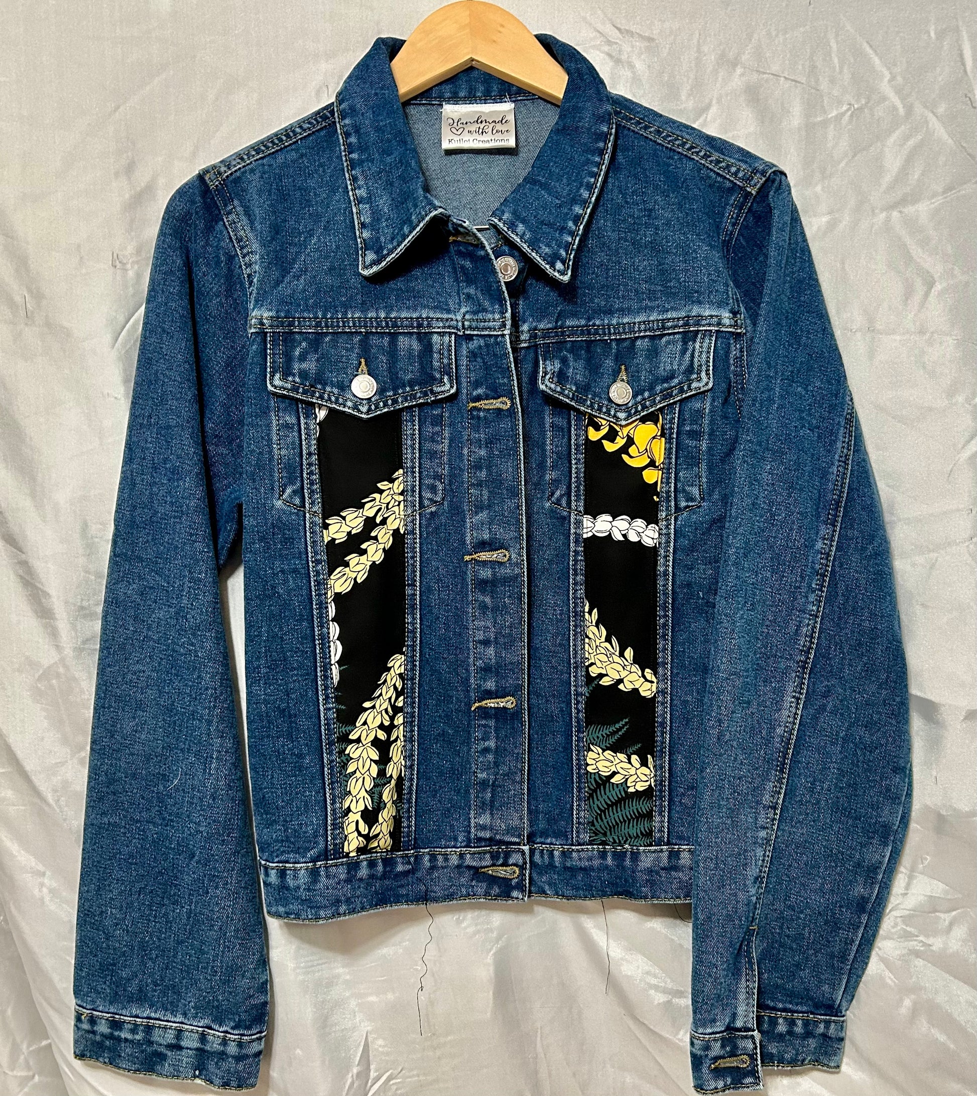 Elevate your style with this stunning, one-of-a-kind full-length denim jacket, lovingly handmade in Hawai‘i. Adorned with hand-sewn pakalana and puakinekine leis, this piece is a graceful tribute to the fragrant, golden blooms cherished throughout the islands.