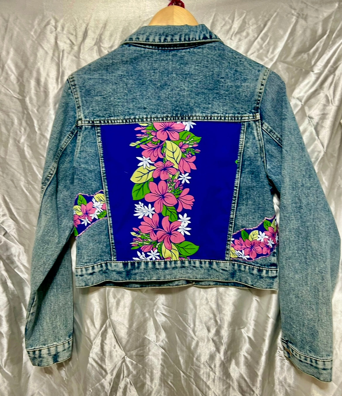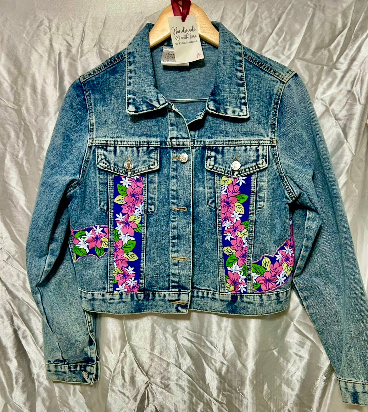 Handmade Wash Denim Jacket – One of a Kind with Pink Flower Leis Fabric Details (Size Small)