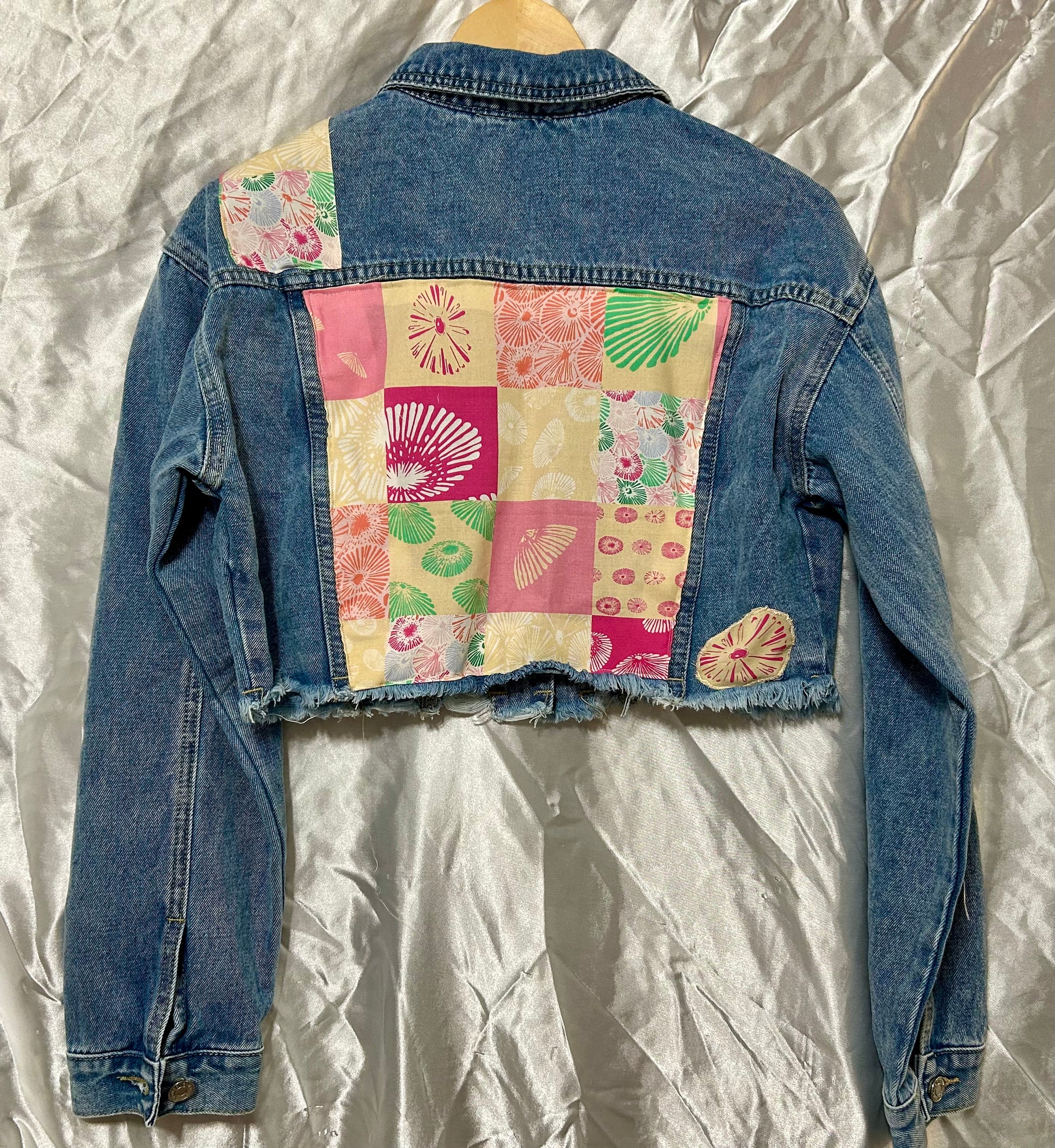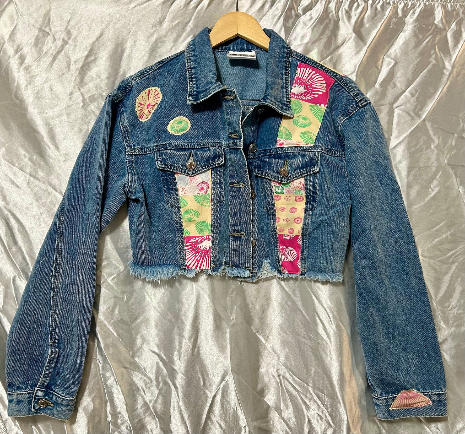 Discover your new favorite piece with this one-of-a-kind handmade wash denim jacket. Crafted with care and attention to detail, this jacket features a unique Hawaiian Opihi shells fabric in the pinks and yellows color scheme sewn into the design, bringing the spirit of the islands right to your wardrobe. The jacket also showcases appliqué Opihi shells, adding texture and a touch of island charm.