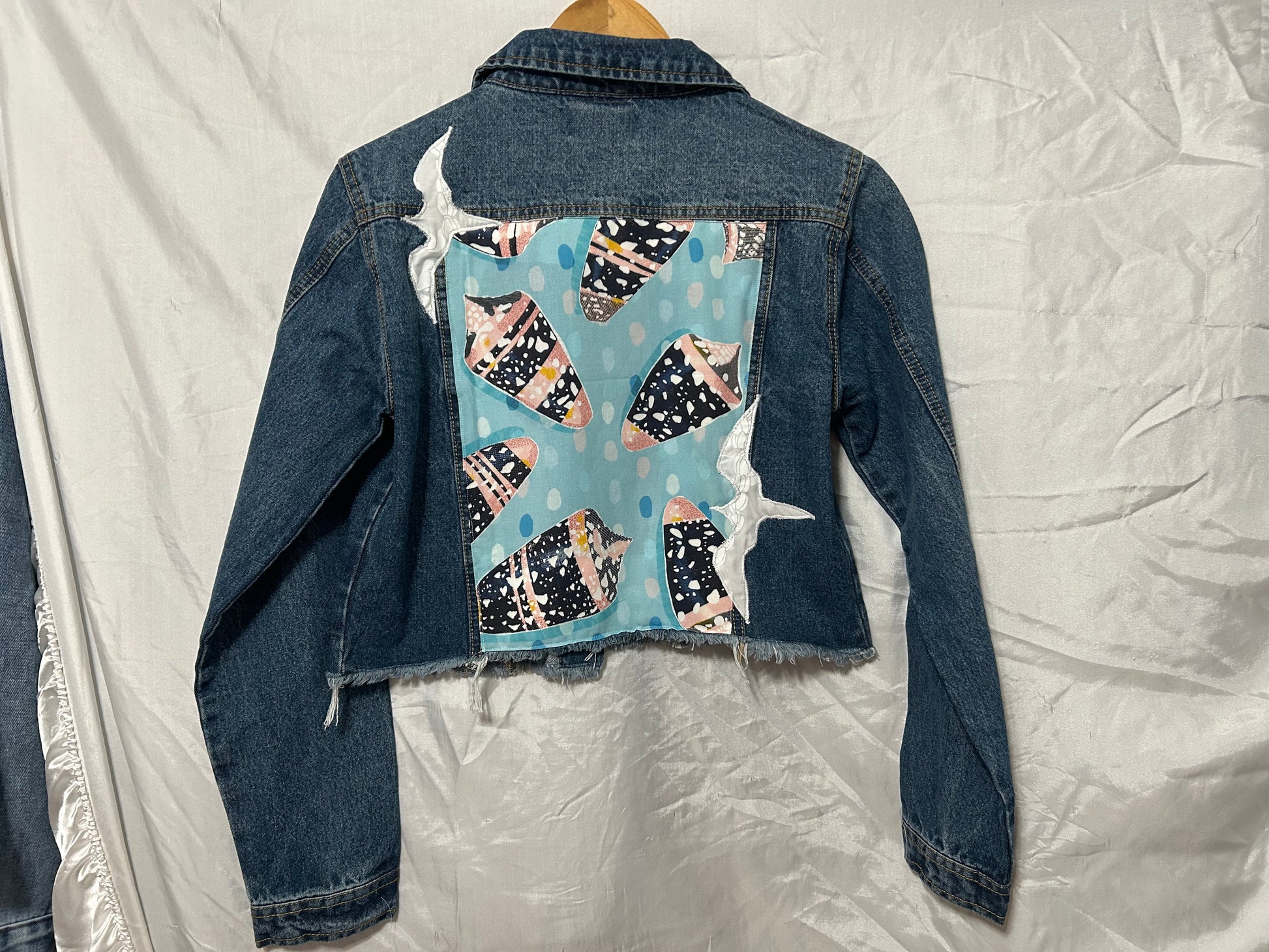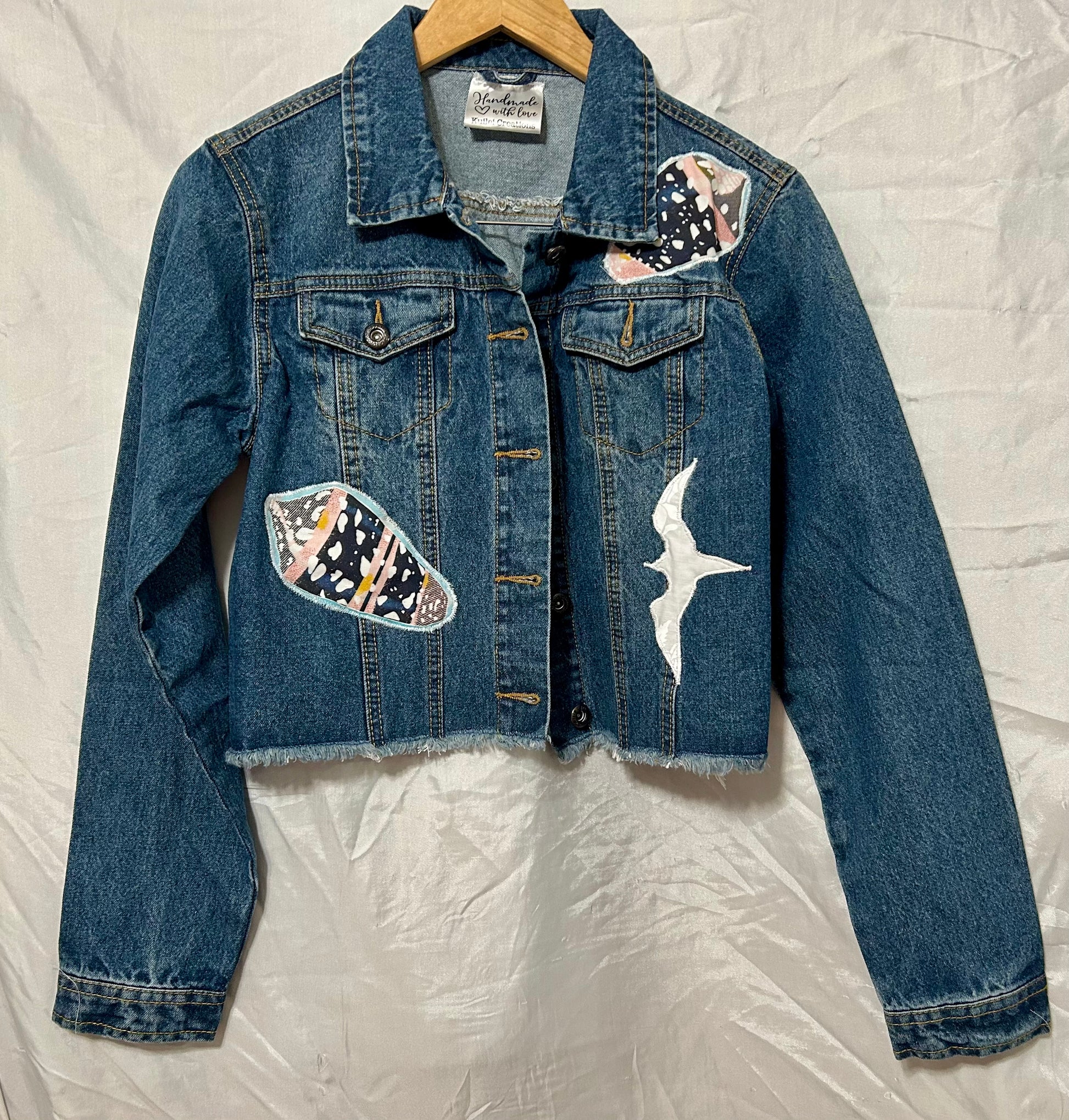 Handmade Cropped Denim Jacket – Medium – Cone Shell Fabric Inlay with ʻIwa Bird Appliqué